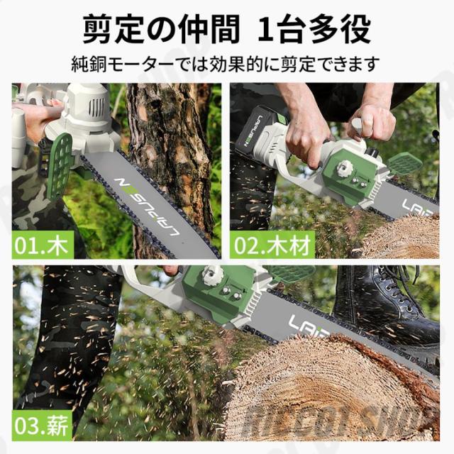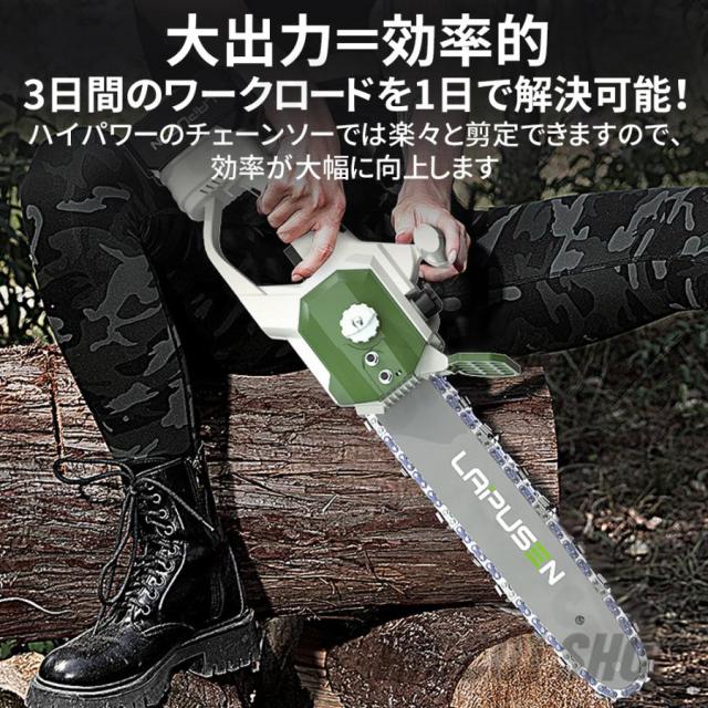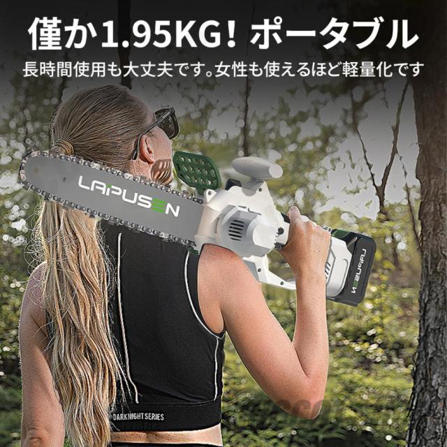 電動コードレスチェーンソー、使用場所を選らず、作業中に線を切るの心配もありません。