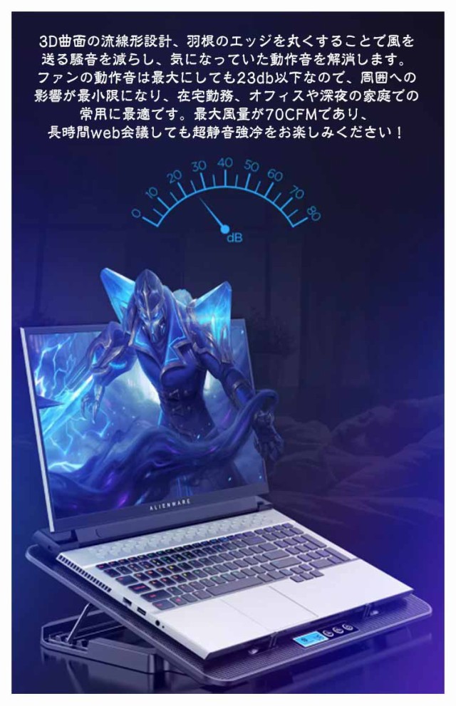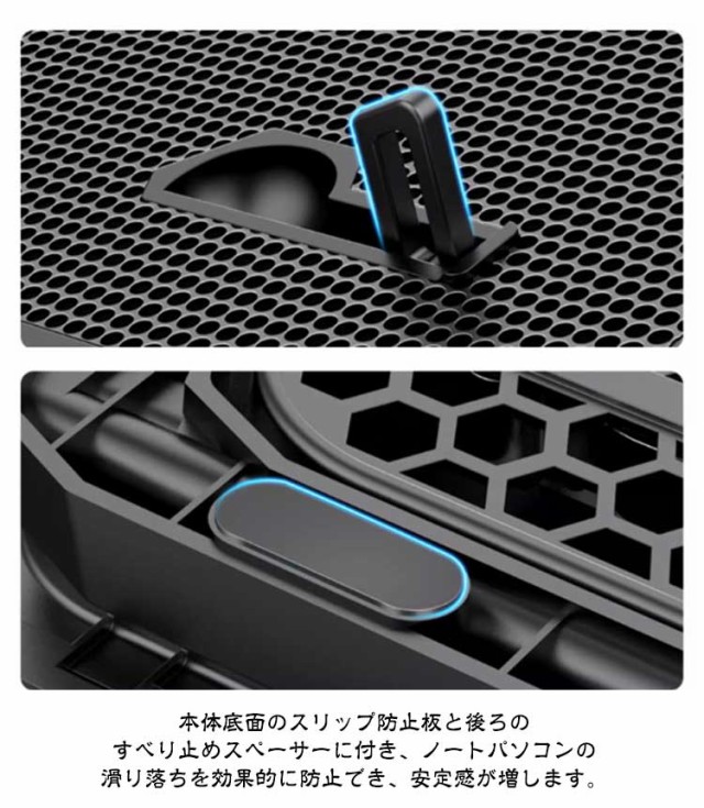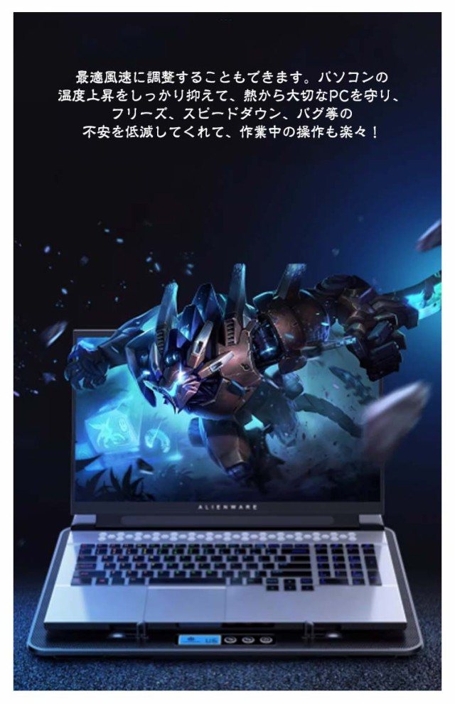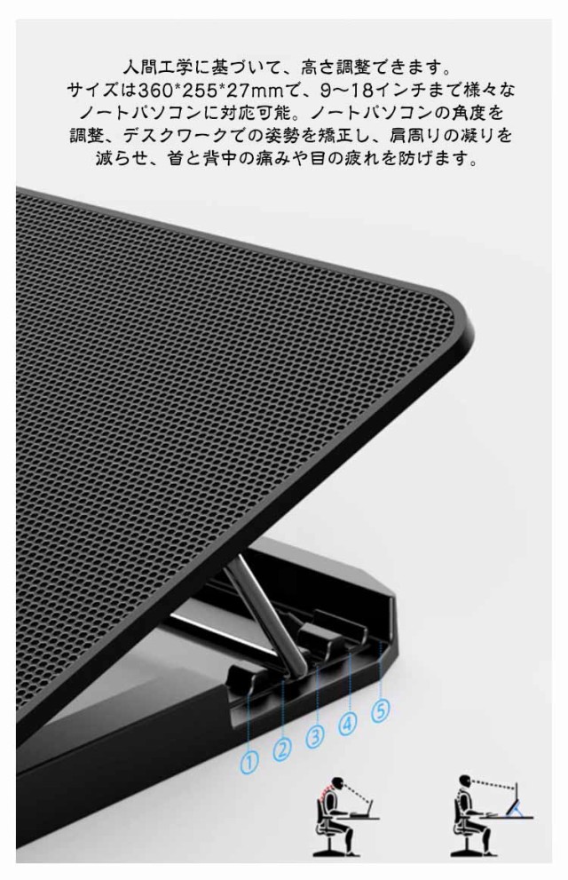 | 【高放熱性鉄メッシュ・6つ大風量ファン快速放熱】高放熱性の鉄メッシュ製、通気性に優れ、すばやくパソコン底面の熱を逃してくれます。6つ大直径ファンを採用、効率良く送風してパソコンを冷却します。数十分以内、PCの熱を15℃程度下げることができます。テレワーク(リモート・在宅勤務)/ オンライン授業・学習・会議等色々場所に大活躍! 【高さ調整】人間工学に基づいて、高さ調整できます。サイズは360*255*27mmで、9?18インチまで様々なノートパソコンに対応可能。ノートパソコンの角度を調整、デスクワークでの姿勢を矯正し、肩周りの凝りを減らせ、首と背中の痛みや目の疲れを防げます。 【23dB超静音】3D曲面の流線形設計、羽根のエッジを丸くすることで風を送る騷音を減らし、気になっていた動作音を解消します。ファンの動作音は最大にしても23db以下なので、周囲への影響が最小限になり、在宅勤務、オフィスや深夜の家庭での常用に最適です。最大風量が70CFMであり、長時間web会議しても超静音強冷をお楽しみください! 【底部滑り止めスペーサー・前置スリップ防止板】本体底面のスリップ防止板と後ろのすべり止めスペーサーに付き、ノートパソコンの滑り落ちを効果的に防止でき、安定感が増します。 【風量調節】最適風速に調整することもできます。パソコンの温度上昇をしっかり抑えて、熱から大切なPCを守り、フリーズ、スピードダウン、バグ等の不安を低減してくれて、作業中の操作も楽々! | |