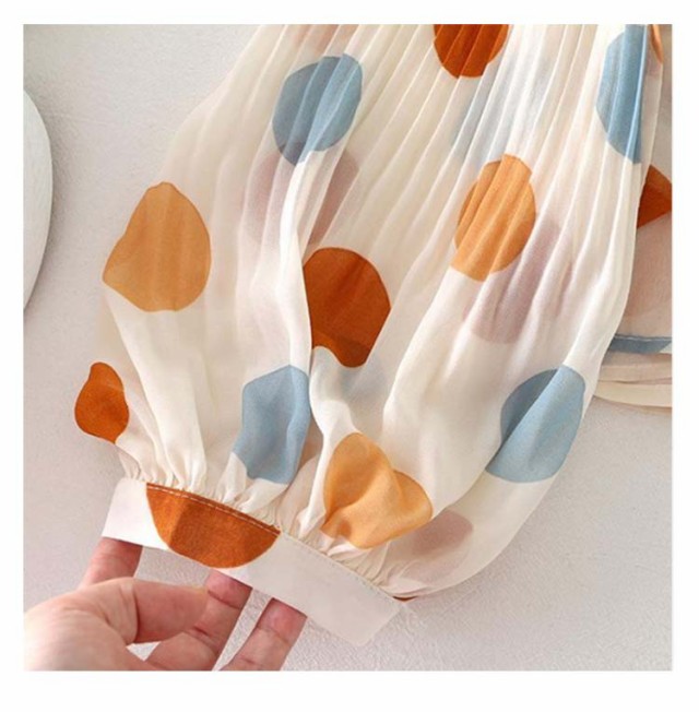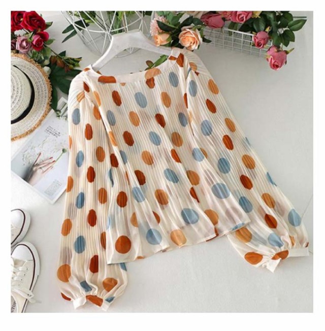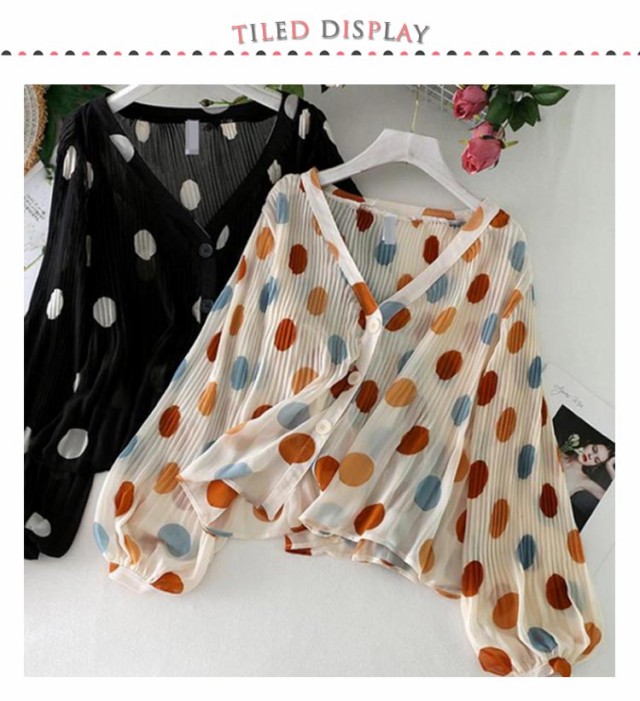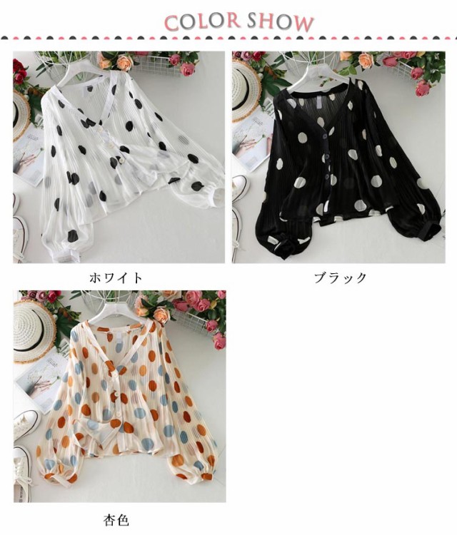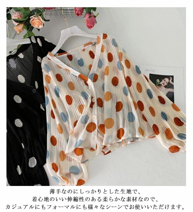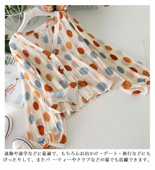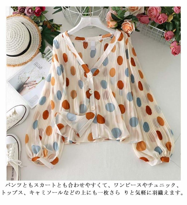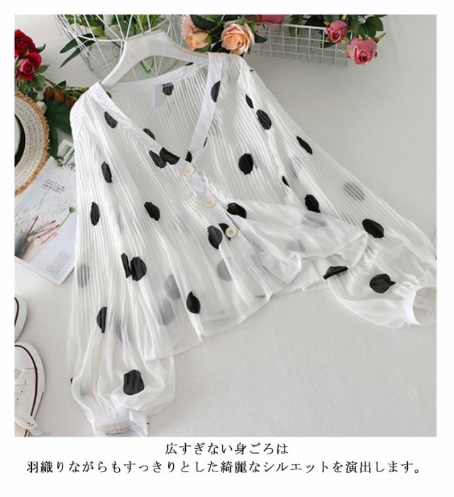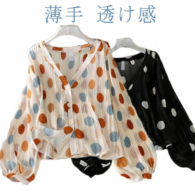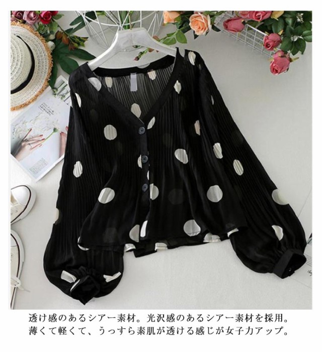シャツ 長袖 UV対策 総柄 シアーシャ 春 vネック カーディガン シフォン 薄手 ブラウス おしゃれ レディース 紫外線対策 シースルー ぽわん袖 日焼け防止 ドット 可愛い 透け感 透け シアー シャツ プリーツ トップス 夏