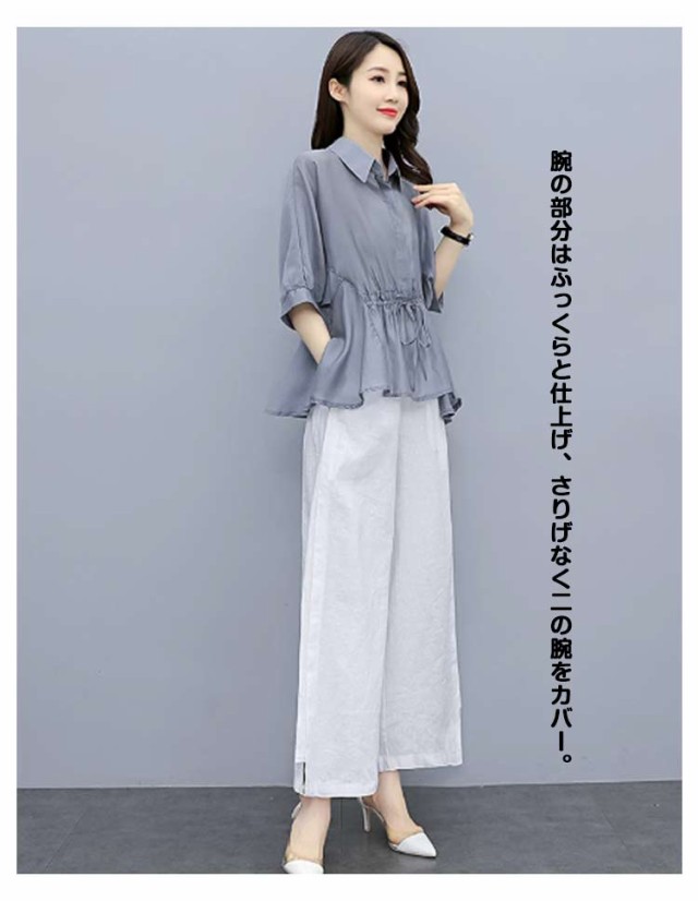 送料無料 透け感 トップス 送料無料 フレア ウエストリボンブラウス 五分袖 シャツブラウス ウエストマーク 羽織 薄手 レディース チュニック おしゃれ 半袖 大人可愛い ゆったり