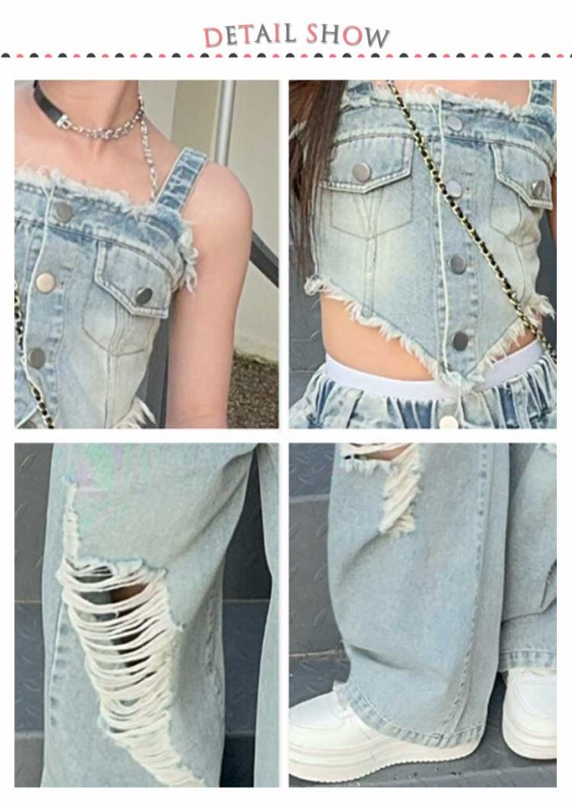 キャミソール キッズ ダンス衣装 セットアップ ヒップホップ キッズ へそ出し 可愛い デニム ストリート デニムパンツ カーゴ ジーンズ ダメージ タンクトップ ジャッズ 団体服 ダンスウェア 発表会 応援団 個性 ガールズ jazz K-POP オシャレ