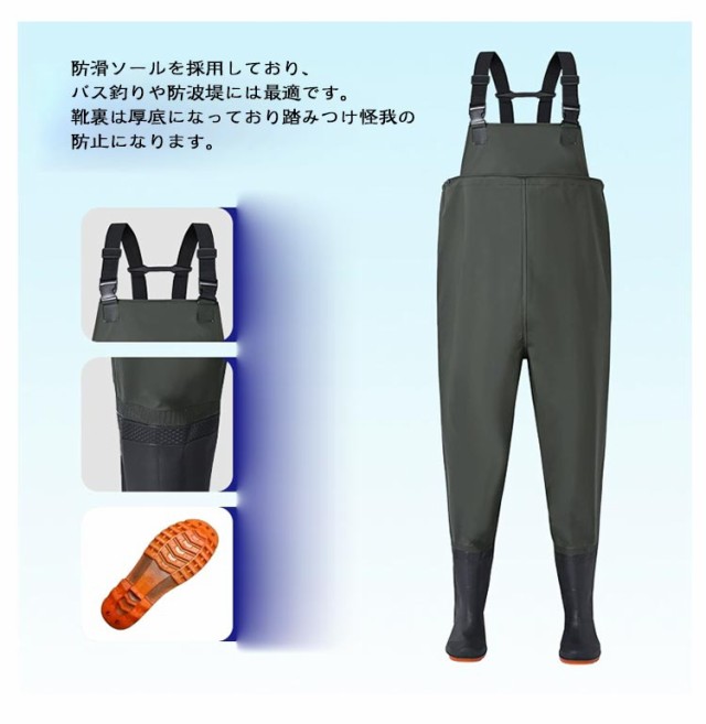 | 【23-28cm】【5colors】【チェストハイウェーダー】 足から胸までを覆う部分に防水性・撥水性の高い生地が使われており、履くだけで体が濡れるのをしっかり防ぐことができます。 チェストハイ型の完全防水ウェーダー、サーフや河川の渓流、本流域の釣りで大活躍です。 PVC加工で防水性・撥水性の高い生地が使われており、水に濡れないのはもちろんですが、水温で奪われる体温の低下スピードを遅くします。 ブーツとズボンは縫い合わせるのではなく、一体化でつくられており、水漏れはしません。通気性もよいこの胴長ウェーダーをはき、渓流に入っても体を乾燥的に保ちます。 防滑ソールを採用しており、バス釣りや防波堤には最適です。靴裏は厚底になっており踏みつけ怪我の防止になります。 様々な場所で活躍:川釣り、潮干狩り、水産加工場、魚市場での現場作業着に、また、田植えや草刈りなど農作業や雪掻き。 海に川に湖に!釣りをするなら必須アイテム!便利なポケット付き。 | |