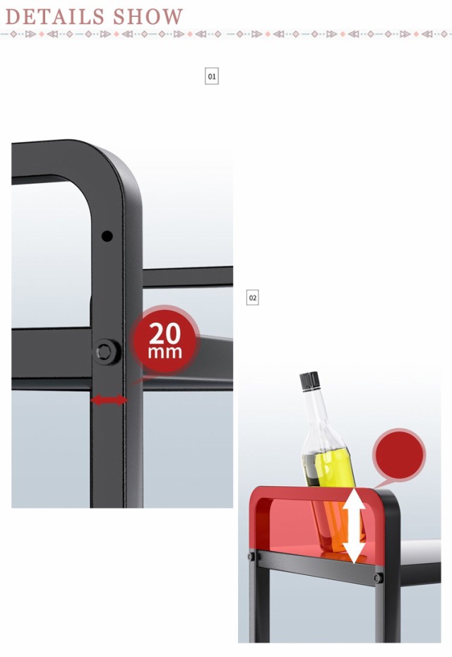 | 最大耐荷重80kg!幅は40-60cmの間で伸縮することができるレンジラック 【レンジラック】電子レンジの上を便利な収納空間に変えるレンジラック。調味料・調理器具などをまとめて置けば、調理スペースも広がり効率アップ。 【横幅伸縮自在】幅は40-60cmの間で伸縮することができ、置きたい場所や電子レンジに合わせてサイズを調節することができます。 【背の高い調理器具にも対応】棚の高さは調節可能。大型レンジや背の高い調理器具なども余裕で収納可能。 【重たい家電もおまかせ】最大耐荷重80kg。頑丈で高耐久なスチールを全面に使用するため、トースターや、ポット、コーヒーメーカーなど普段使う重たい家電や鍋も置けます。 【お手入れ簡単】表面は粉体塗装加工を施してあるので、水・汚れ・キズ・熱に強くお手入れ簡単。 【小物フック付き】小物を掛けるのに便利なフックが6個付属。キッチンバサミや鍋つかみなどが掛けられます。 | |
