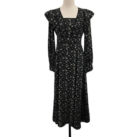 【中古】マーキュリーデュオ ワンピース フレア ロング パイピング ラッフル 花柄 長袖 S 黒 白 ブラック ホワイト