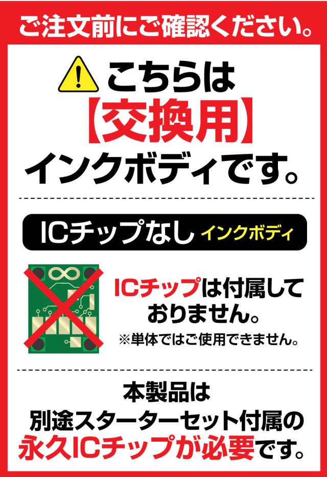 商品の特性:繰り返し使える永久ICチップ専用の交換用インクボディです。 別途、永久ICチップ付きスターターセットが必要になります。 本製品だけでは、ご使用になれませんので予めご了承ください。