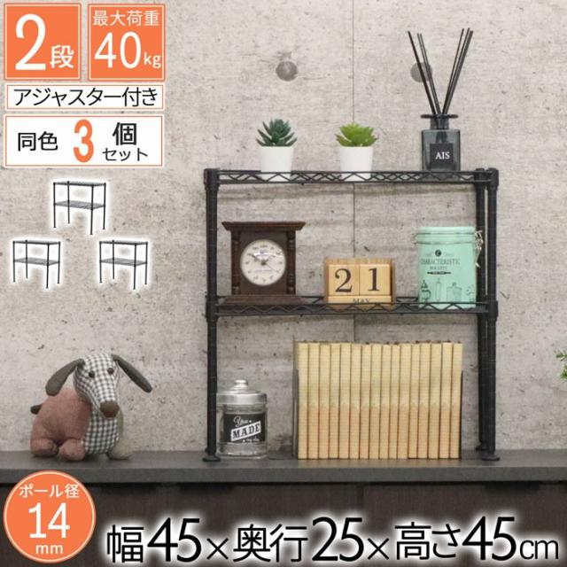 商品名:卓上 ラック ミニ 2段 45幅 3個セット 収納 棚 おしゃれ ミニラック キッチンラック ブラック 黒 幅45cm 奥行25cm 高さ45cm 頑丈 丈夫 デスク上 シンク下 収納 二段ラック オープンラック スチールラック 隙間収納 スパイスラック コンパクト 一人暮らし ワンルーム シンプル 可動棚 ポール径14mm スリム 省スペース 調味料ラック デスク下 ラック 机下 玄関収納 多目的ラック フリーラック 整理整頓 組立簡単 アジャスター付き