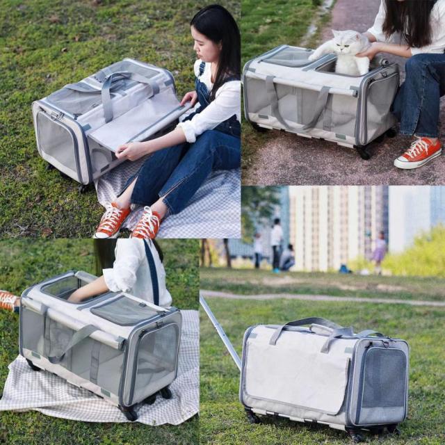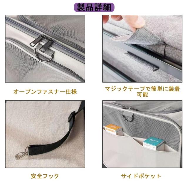 【通気性・視認性】5面(天面、側面、前後)はメッシュ素材で、空気の循環がよく、ペットが快適に呼吸できます。虫が入りにくく、ペットを詰め込まないペット用ベビーカーでも快適です。上部と側面のメッシュを開くことができるので、ペットは頭を上げて挨拶したり、座って一緒に景色を楽しんだりできます。