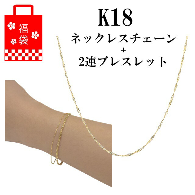 K18 福袋 18金 ネックレス チェーン ブレスレット チェーンブレス スクリューチェーン 40cm 2連 18金 ブレス バングル 2重 重ね付 アズキチェーン アクセサリー ジュエリー 2022 ラッキーバッグ ハッピーバッグ