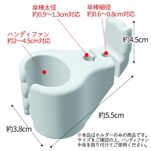 | 取り付けサイズ | (傘棒取り付け部分) 細径/約6〜8mm対応 太径/約9〜13mm対応 (ハンディファン取り付け部分) 約20〜45mm対応 |