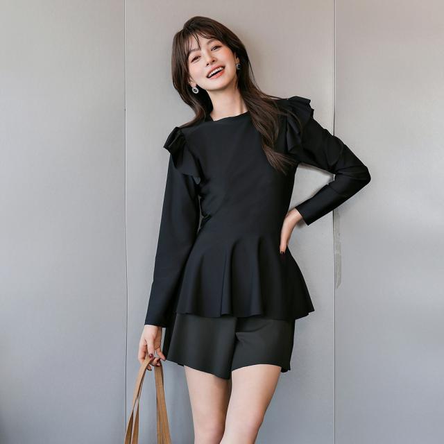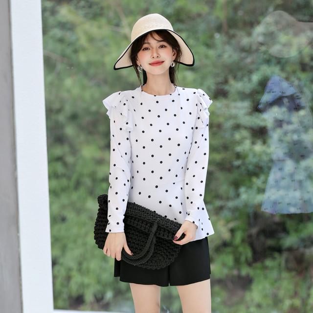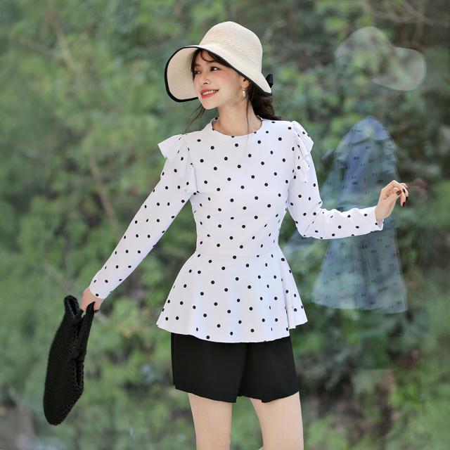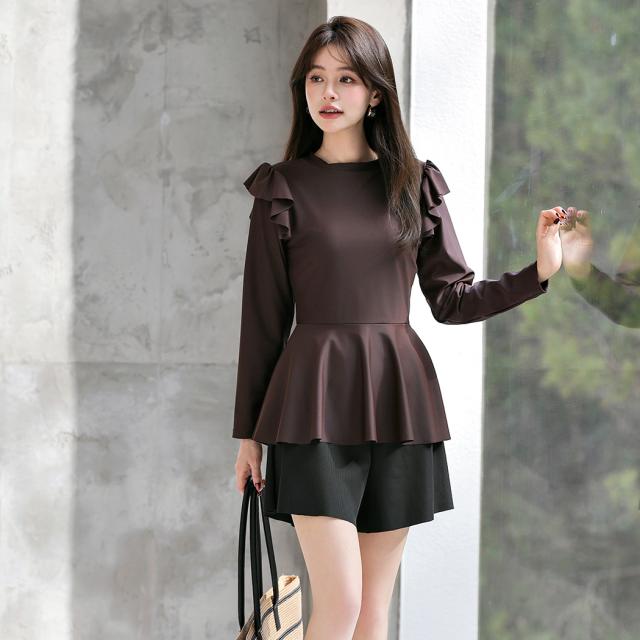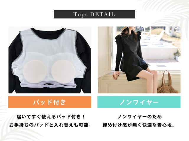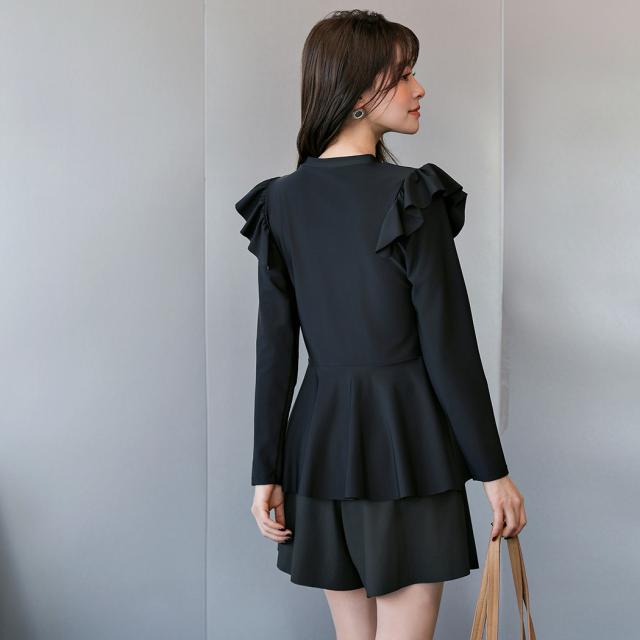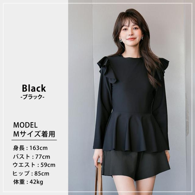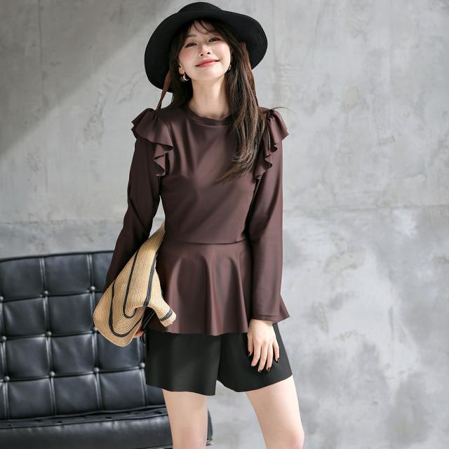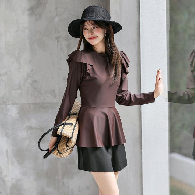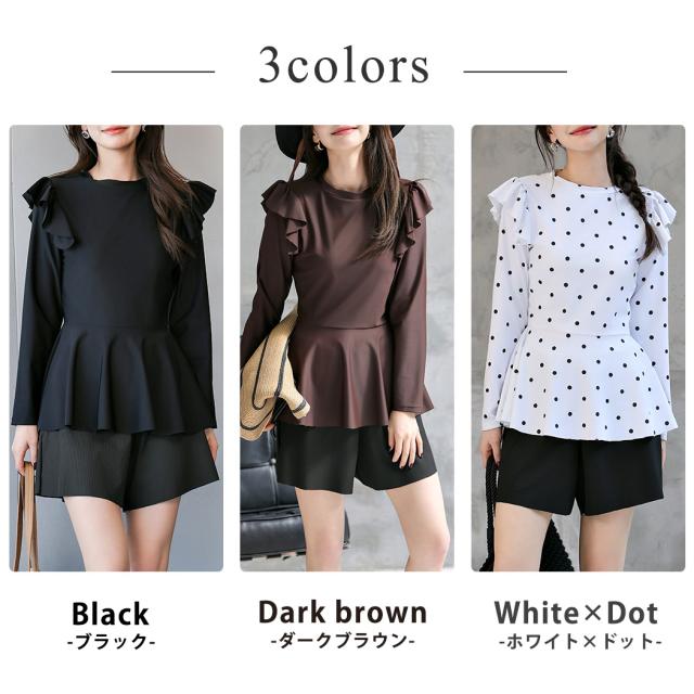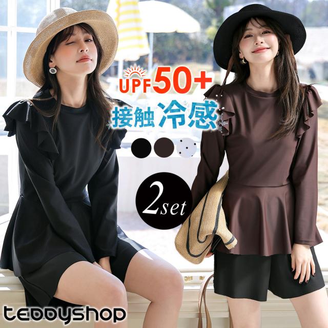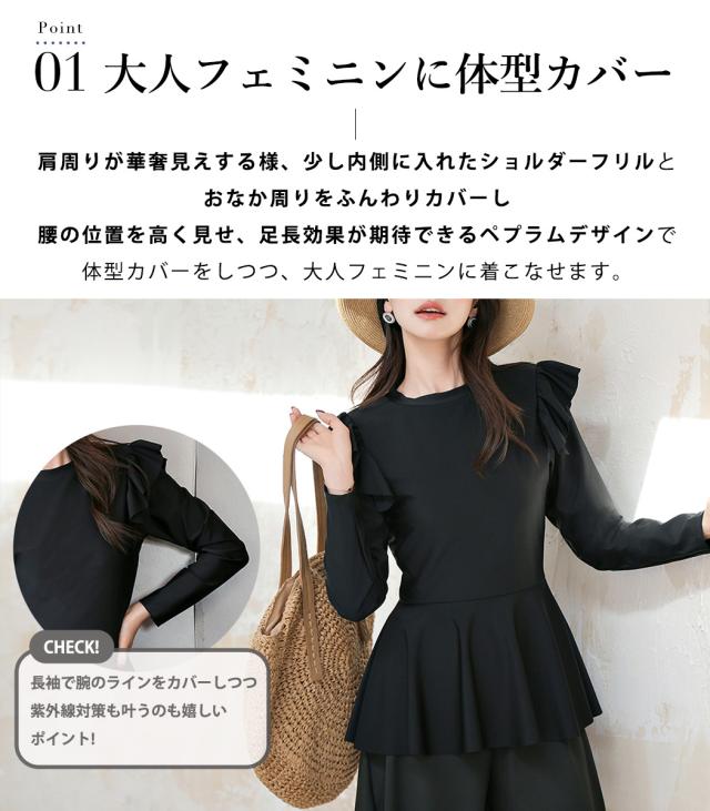 2025年新作 水着 レディース 体型カバー 2点セット 洋服見えラッシュガードトップス ペプラム 長袖 ブラ一体型 袖あり ショルダー フリル 紫外線対策 UPF50+ UVカット率100% 接触冷感 パンツ フレア リブ ママ ノンワイヤー 二の腕 ウエスト ヒップ お尻 太もも