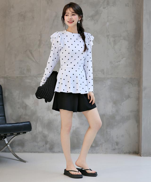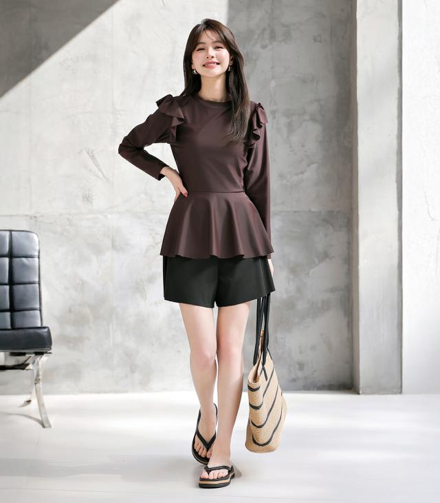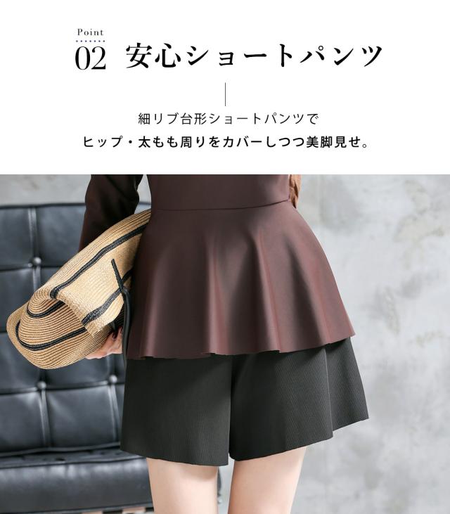 細リブ台形ショートパンツで、ヒップ・太もも周りをカバーしつつ美脚見せ。
