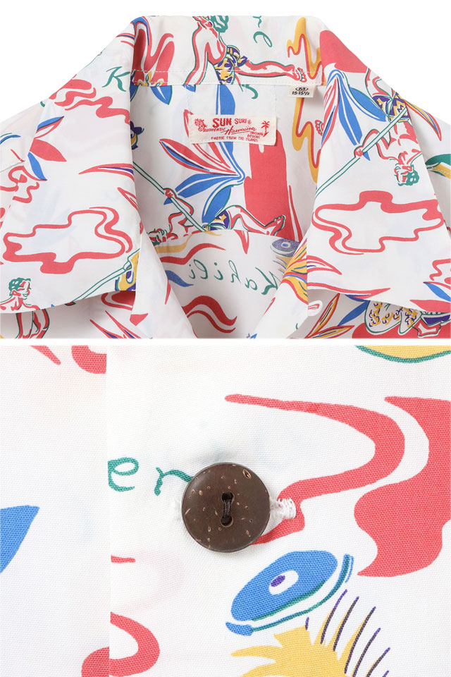 アロハシャツの黄金時代とされる1930〜50年代にかけて作られた「ヴィンテージ」と呼ばれる貴重なアロハシャツを再現し、現代に蘇らせているブランド「SUN SURF」から、レーヨンアロハシャツ「HAWAIIAN HULA」(SS39411)のご紹介です。 フラ、ダイビング、サーフィンなど、ハワイのアクティビティは当時からアロハシャツのモチーフとしても高い人気がありました。 戦後から本格的にシャツのマーケットに参入したホロホロ・アパレル・マニュファクチャリング社のブランド「ホロホロ」が製作した一枚です。 トーマス・スティールによって書かれたアロハシャツの専門書「The Hawaiian Shirt」にも掲載されており、ヴィンテージ・コレクターからの支持も厚く、コンディションの良い個体に出会えるチャンスは少なくなってきています。 ボディーには、てろんとしたレーヨン羽二重の生地を採用。 抜染プリントで仕上げられた逸品です。 | ||||||||||||||||||||||||||||||