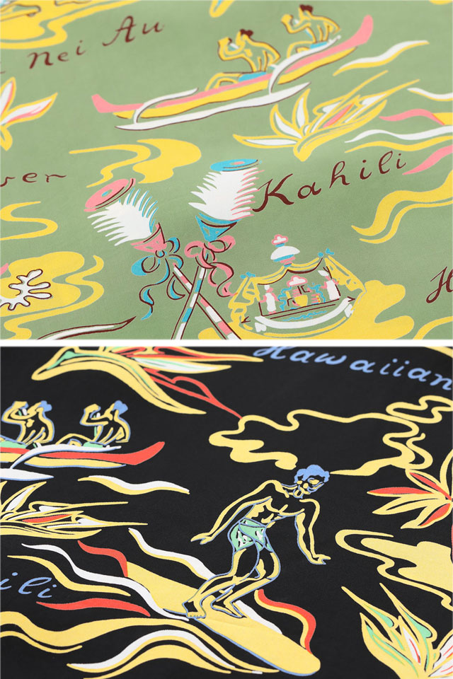フラ、ダイビング、サーフィンなど、ハワイのアクティビティは当時からアロハシャツのモチーフとしても高い人気がありました。