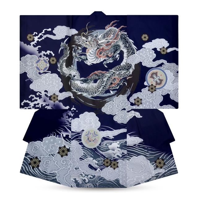 男児 産着 龍 クリーム ネイビー 紺色 レンタル お宮参り 着物 帽子 よだれかけ セット【男の子 貸衣装 和服 祝い着 初着 産着 往復送料無料】かっこいい