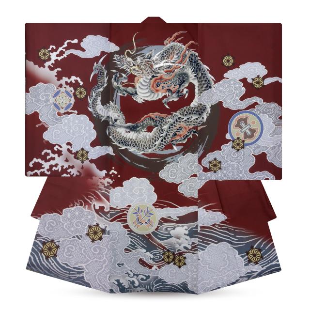 男児 産着 龍 赤 朱色 レンタル お宮参り 着物 帽子 よだれかけ セット【男の子 貸衣装 和服 祝い着 初着 産着 往復送料無料】かっこいい