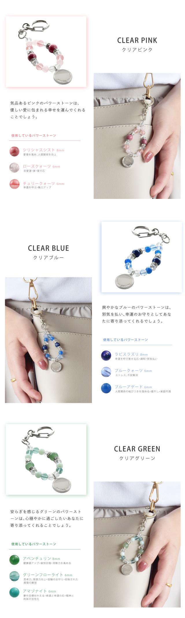 | クリアグリーン | ・ アベンチュリン 8mm 健康運アップ 疲労回復 洞察力を高める ・ グリーンフローライト 6mm 思考力、発想力の向上 受験のお守り 抑制された感情の開放 ・ アマゾナイト 6mm 夢や目標を叶える 希望と幸運 精神と肉体の活性化 |