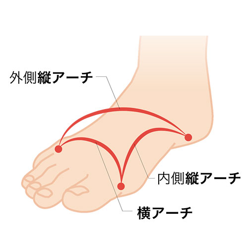 人間の足には3つのアーチがあると言われています。土踏まず部分の内側縦アーチ、かか とから小趾球にかけての外側縦アー チ、母趾球から小趾球にかけての横 アーチ。これら3つのアーチがバラ ンスを取りながら、 身体全体を支え る大変重要な役割を果たしています。