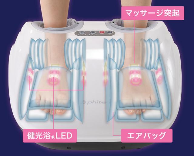 縦・横アーチのダブルケアで足裏から変える足裏のトラブルに悩む方からアスリートのフットケアまでこれ1台。左右合計14枚のエアバッグ&足裏の突起を組み合わせ、足の縦・横アーチにアプローチするファイテン式マッサージの手技を再現。さらに、ファイテンの光技術『健光浴 』の光が足を包み込んでしっかりケア。かかと部分にバイブレーション機能を搭載し、ふくらはぎ、ひざ、太ももまでここちよくマッサージ。