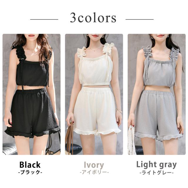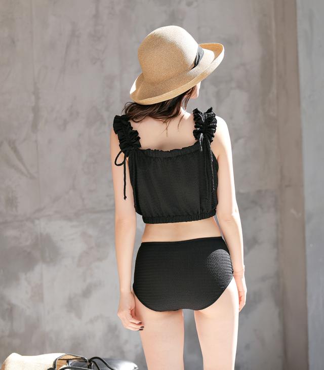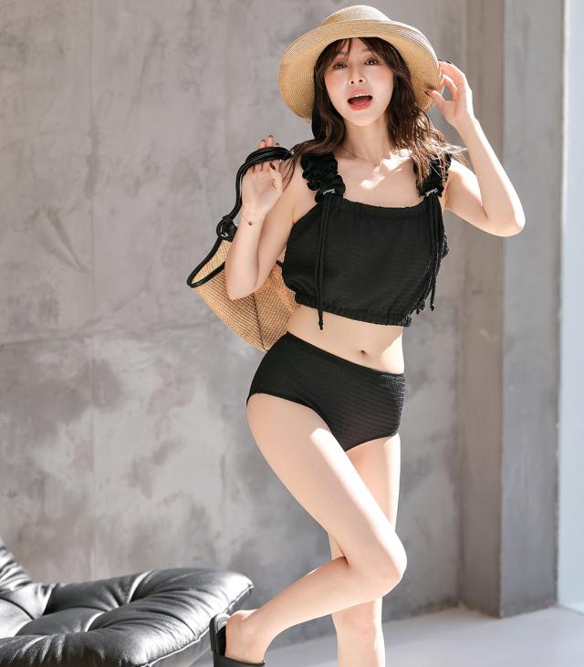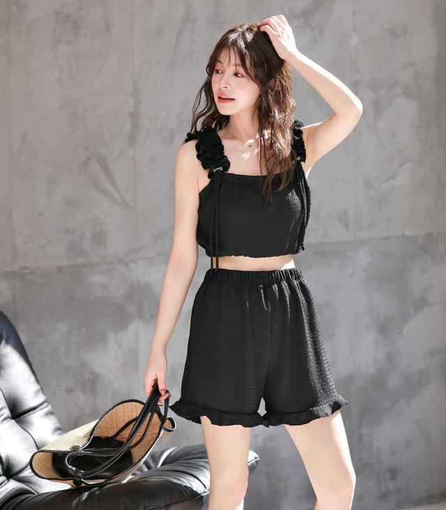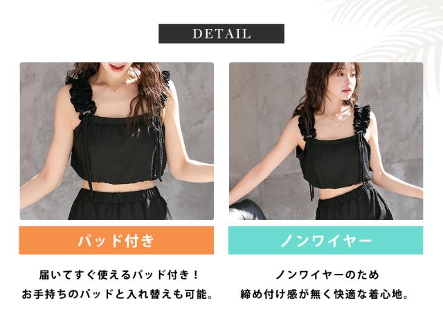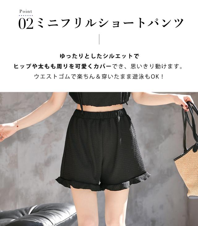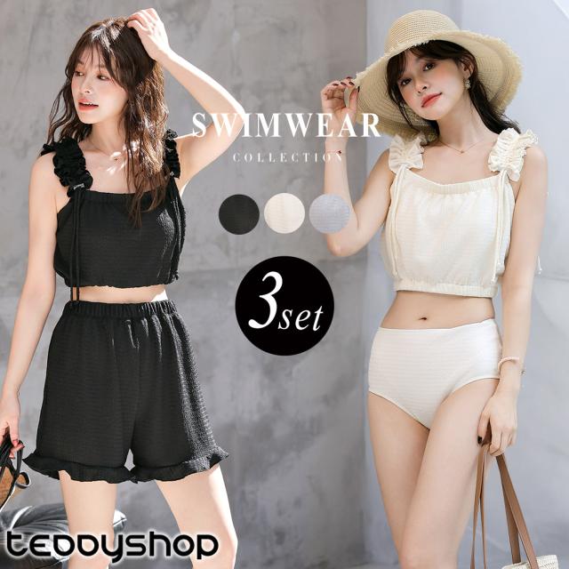 夏新作 水着 体型カバー ビキニ レディース ショートパンツ 3点セット セパレート ギャザーフリル 肩ひも 裾ゴム パンツ 裾フリル ハイウエスト ノンワイヤー パッド付き バスト 盛れる アンダー 3段階調節 ウエスト ヒップ 太もも カバーアップ 黒