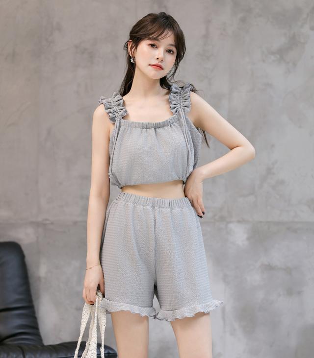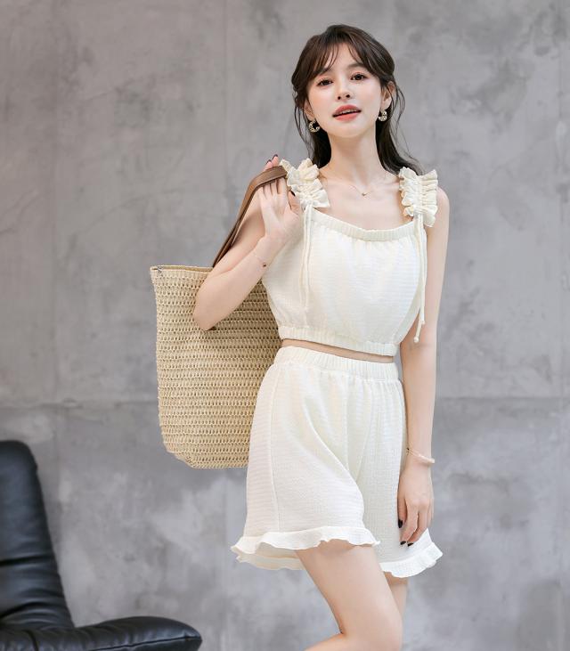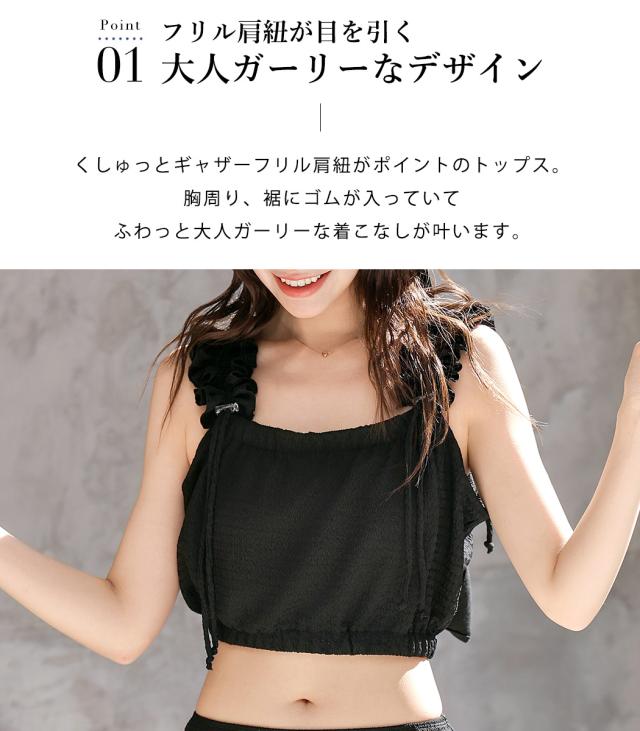 くしゅっとギャザーフリル肩紐がポイントのトップス。