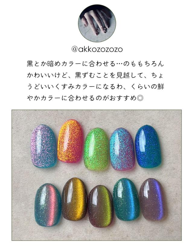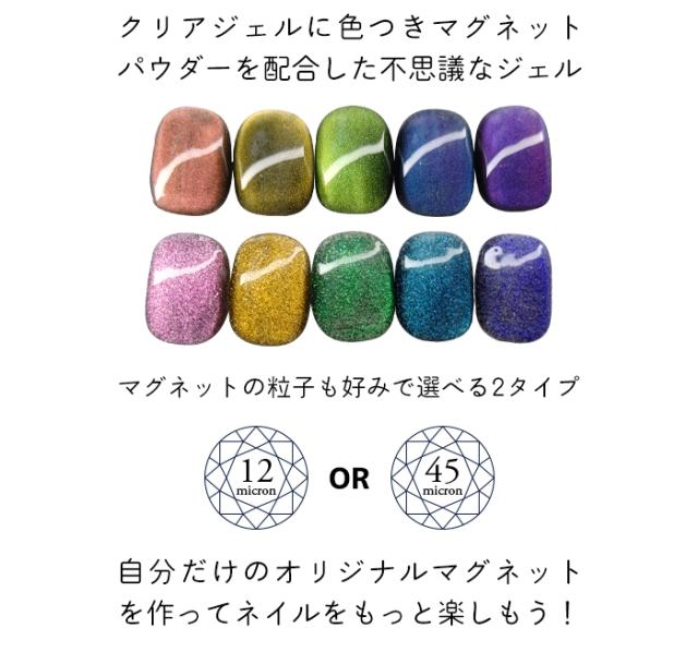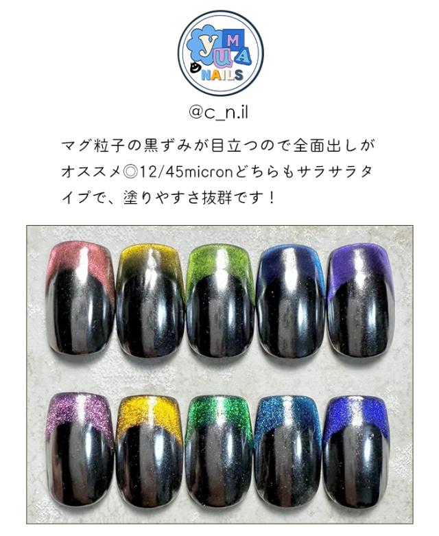 クリアジェルに色つきマグネットパウダーを配合した 超個性的なマグネットジェル♪ マグネット特有の黒ずみがあるので、黒ベースに重ねたり 鮮やかなクリアカラーに重ねたり、楽しみ方は無限大!! 黒ベースに塗布すると、宇宙のような美しさで 七夕などのイベントネイルや、夜空をモチーフにした ネイルにもぴったりです◎ また、マグネットの粒子も好みで選べる2タイプ。 12ミクロンと45ミクロンとご準備しました! 12ミクロンはほのかに光るマグネット 45ミクロンはギラギラと輝きます★ デザインによって使い分けもできる万能なマグネットジェルです♪ |