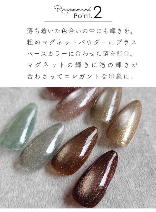 大人の上品さを引き立てる、シックなカラーのマグネットジェル。 落ち着いたシックなカラーが魅力♪ 銀箔や銀箔が織り交ぜられた独自のフォーミュラで、どこかエレガントな輝きを放ちます。 普段のネイルに華やかさを加えるだけでなく オフィスネイルやフォーマルなシーンにもぴったりな上品な仕上がりが特徴です。 |