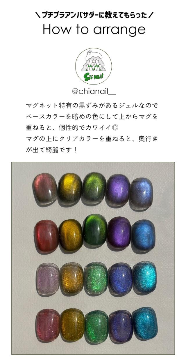 クリアジェルに色つきマグネットパウダーを配合した 超個性的なマグネットジェル♪ マグネット特有の黒ずみがあるので、黒ベースに重ねたり 鮮やかなクリアカラーに重ねたり、楽しみ方は無限大!! 黒ベースに塗布すると、宇宙のような美しさで 七夕などのイベントネイルや、夜空をモチーフにした ネイルにもぴったりです◎ また、マグネットの粒子も好みで選べる2タイプ。 12ミクロンと45ミクロンとご準備しました! 12ミクロンはほのかに光るマグネット 45ミクロンはギラギラと輝きます★ デザインによって使い分けもできる万能なマグネットジェルです♪ |