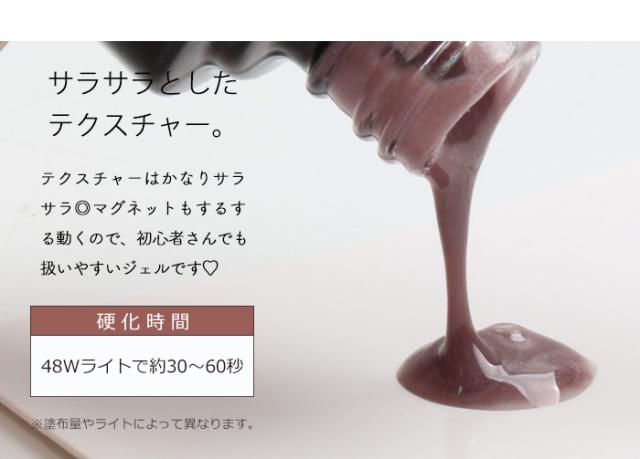 ぽわんと光るうるぷるマグネットジェル。 肌馴染みのいいくすみピンクカラーに微粒子マグネットパウダーを配合◎ 透け感のあるちゅるんカラー。 上品な輝きと大人っぽい色合いが、女性らしさを引き立てます♪ 控えめな輝きなのでオフィスネイルにもぴったりです。 |