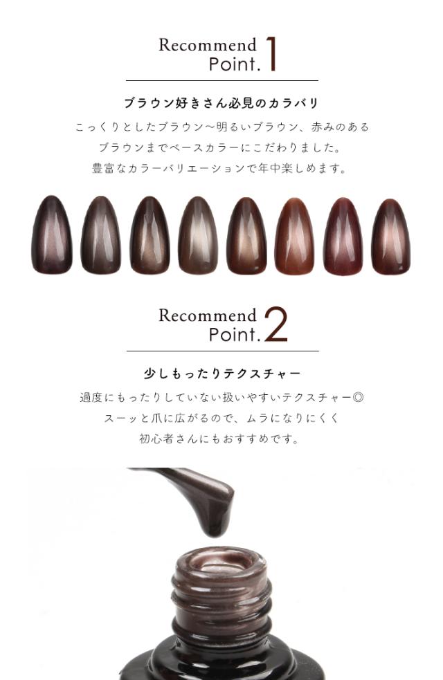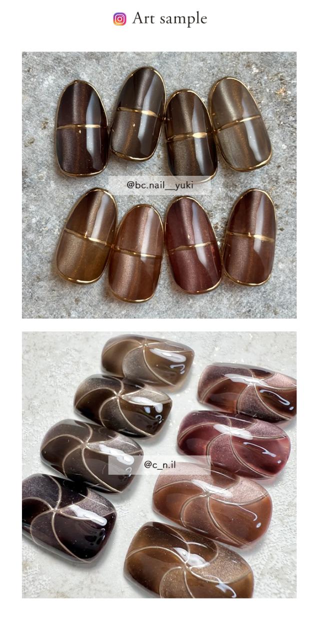 ふんわり優しく輝く微粒子マグネットジェル。 とろけるような絶妙なブラウンカラー。 こっくりとした濃いブラウン〜明るいブラウン、赤みのあるブラウンまで 豊富なカラバリで秋ネイルはもちろん年中楽しめます◎ また、ブラウンカラーは肌になじみやすいので オフィスネイルにもおすすめ♪ |