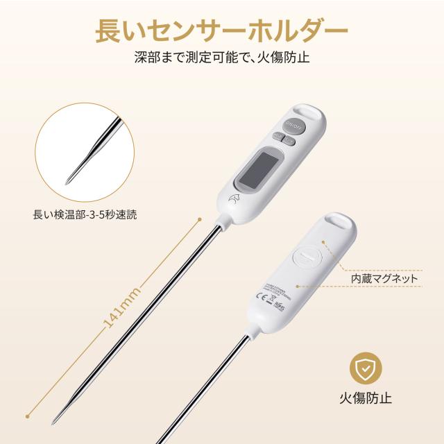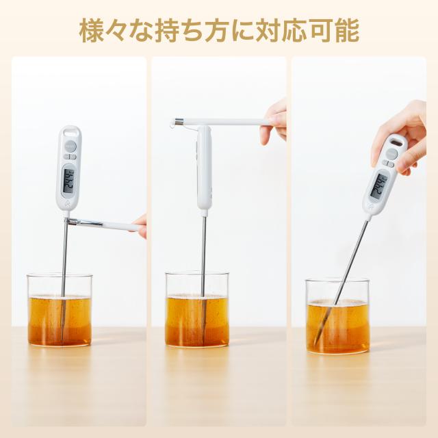 手が熱源に近づきすぎない14.1cmの長さ。-50℃〜300℃まで対応し、HOLD機能や℃切替も搭載。料理からベビーミルクまで便利。