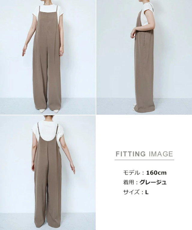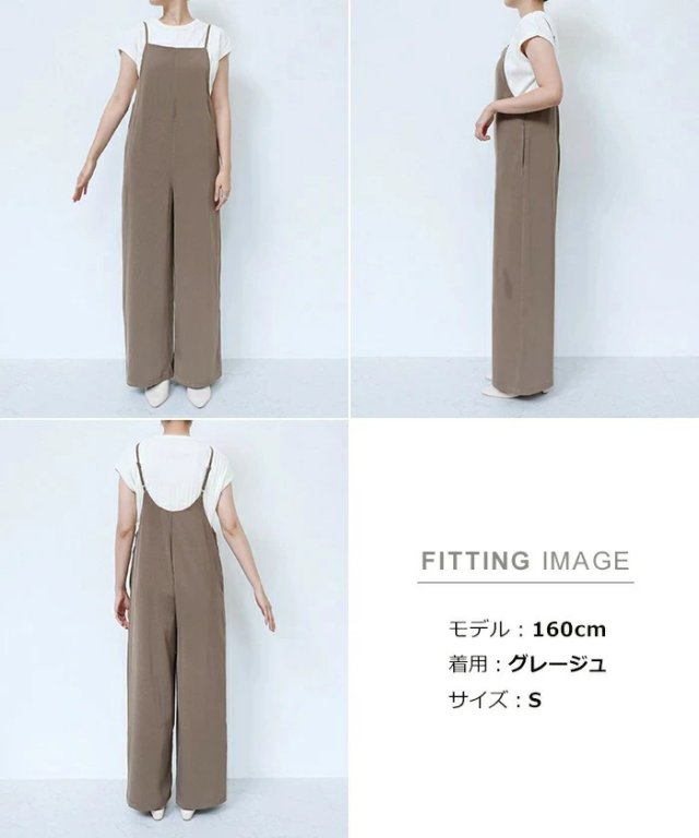 着丈:126cm(肩ひも含めない)、身幅:47cm、股上:59cm、股下:71cm、裾幅:33cm、わたり:35cm、肩ひも:7cm〜15cm