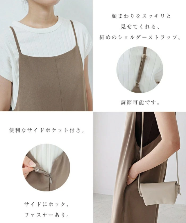 顔まわりをスッキリと見せてくれる細めのショルダーストラップは、アジャスター付きでお好みの丈感に調節可能です。