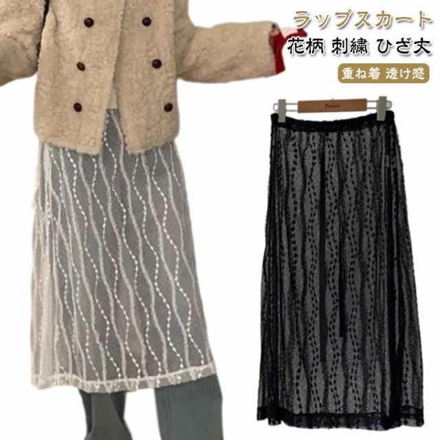 シアーレース レディース 巻くスカート 春夏 ひざ丈 シースルーボトムス SNS話題スカート 巻きスカート シアーレース ラップスカート 重ね着 レイヤード フラワー刺繍 ベージュ ブラック レイヤードラップスカート 総レース 花柄 刺繍 巻き チュール ミモレ丈