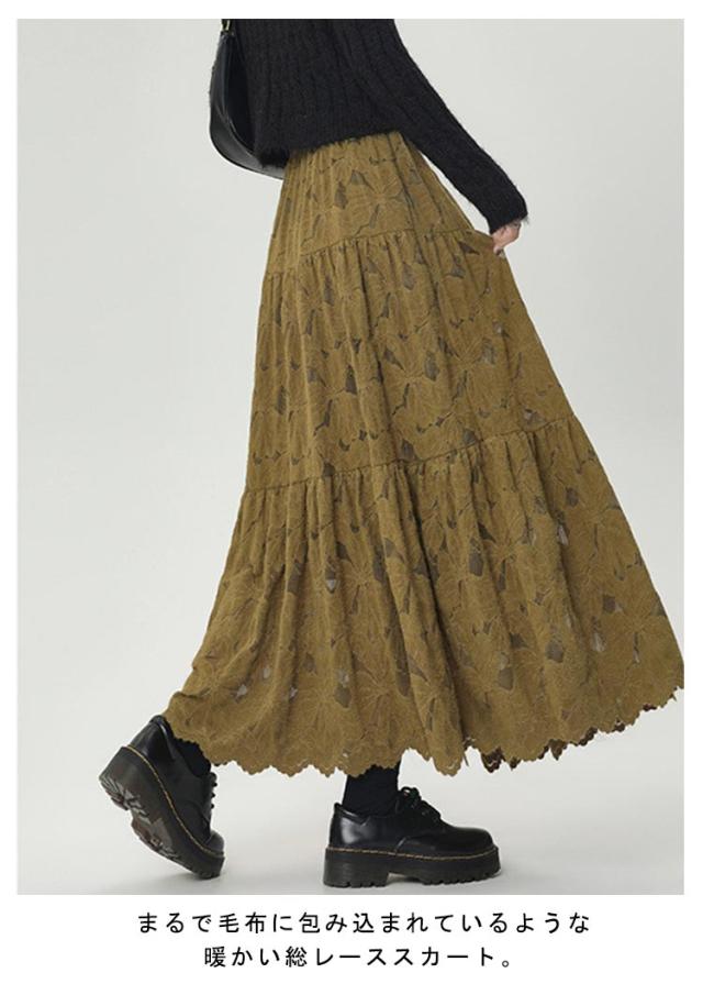 こっそり暖か 裏起毛レーススカート マキシ丈 総レーススカート 裏起毛裏地付き 暖スカート フレアスカート Aライン ロングスカート 花レース マキシ ウェストゴム 体型カバー 大きいサイズ 秋 冬 姫系 送料無料 お呼ばれ フェミニン エレガント かわいい