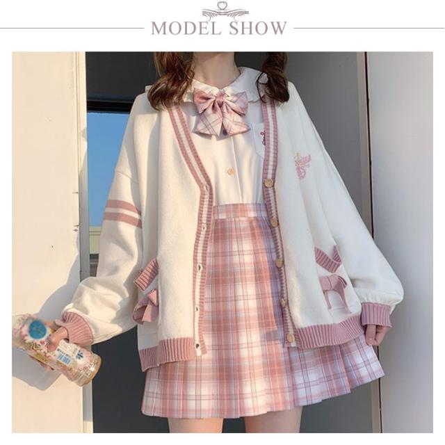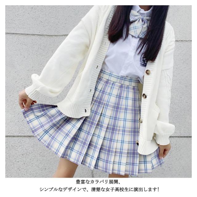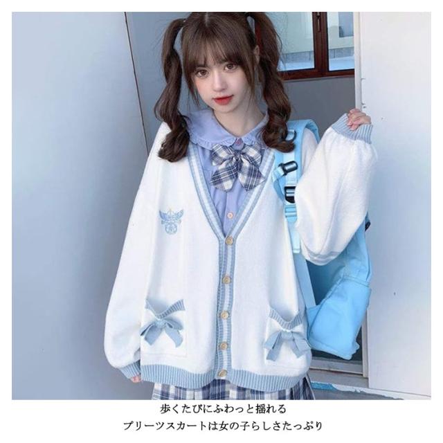 4点セット 制服 カーディガン+長袖シャツ+スカート+リボン 上下セット スクール 学生服 プリーツスカート コスプレ 仮装 女子高生 JK制服 高校生 可愛い 学園祭 大人 レディース コスチューム衣装 秋 冬 春 中学 ピンク ブルー 送料無料