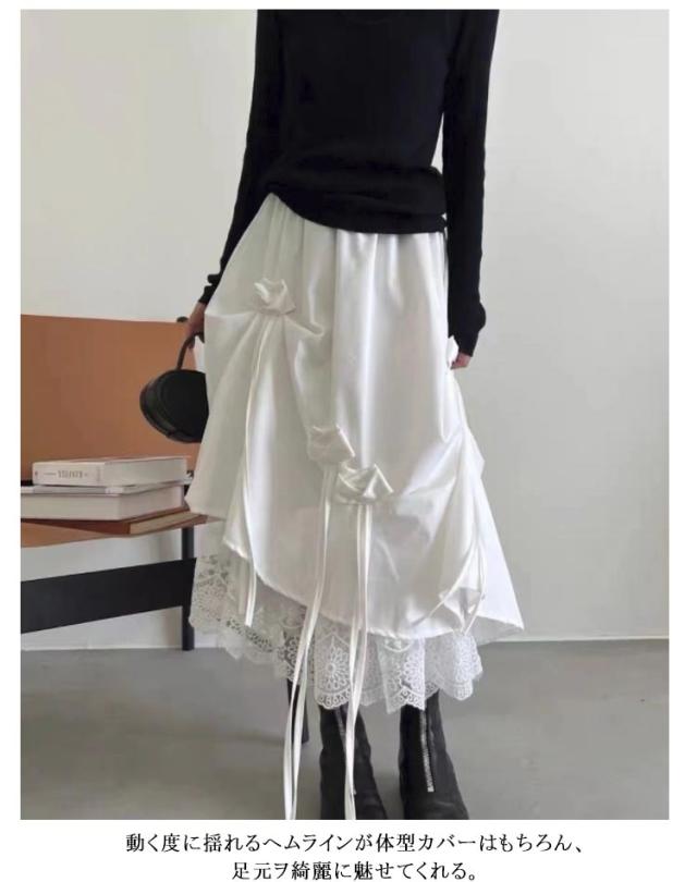 アシンメトリー 春 冬 レディース フレアスカート スカート 秋 裾変形デザインスカート アシンメトリー ミモレ丈 ブラック ボトムス 夏 黒 ホワイト 白 レース切り替えヘムライン ウエストゴム 調節 ひざ下 ゆったり きれいめ