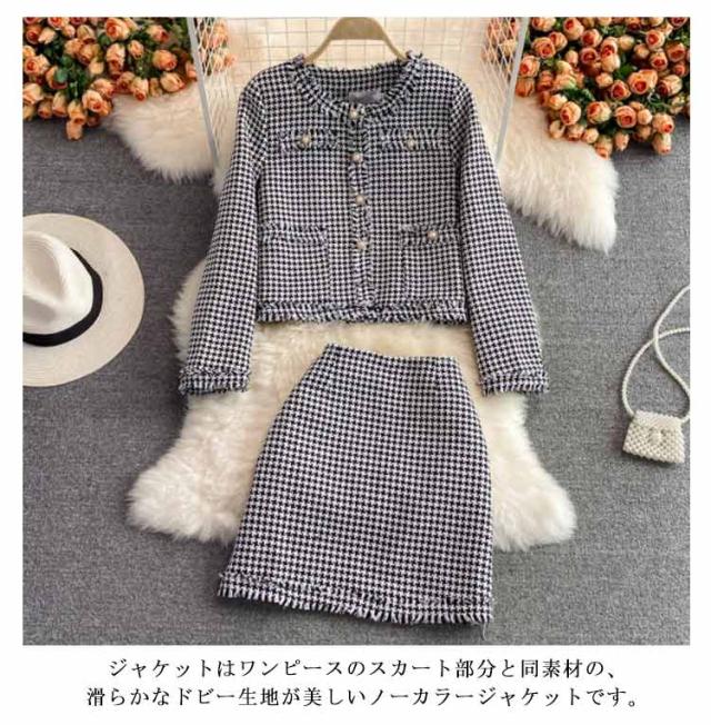| 着回し自在な2点セットフォーマルスーツです。 ジャケットはツイード生地で、クルーネックにコンパクトなシルエットのノーカラージャケットです。 ジャケットはワンピースのスカート部分と同素材の、滑らかなドビー生地が美しいノーカラージャケットです。 スカート部分はゆったりと膨らむタック入りのAラインシルエットです。 | |