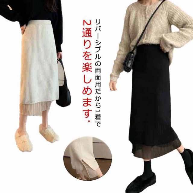 スカート ニットスカート 両面用 リブニットスカート Aライン ミモレ丈 ミディアム 膝下丈 リバーシブル 秋冬 ロングスカート チュール フェミニン おしゃれ 可愛い