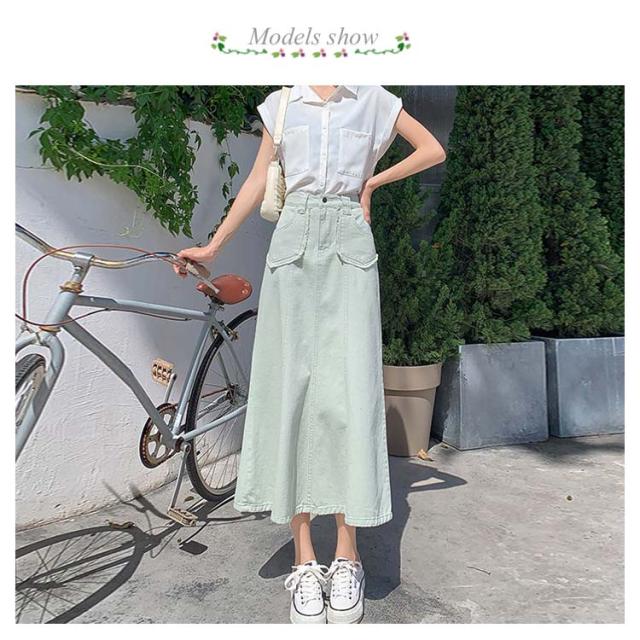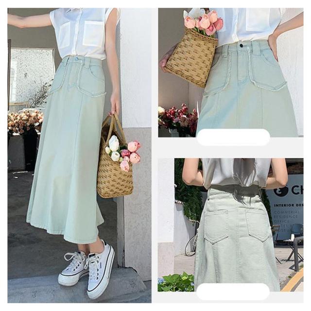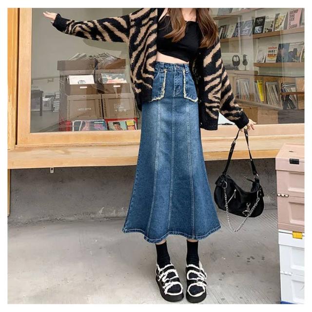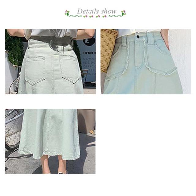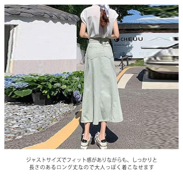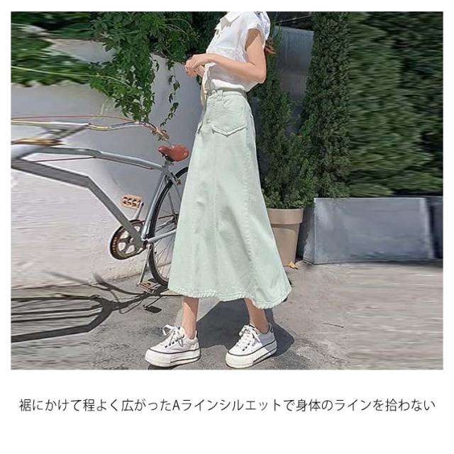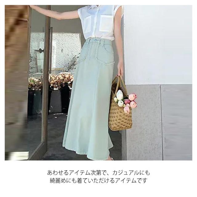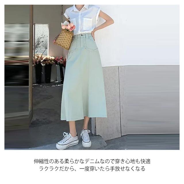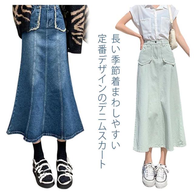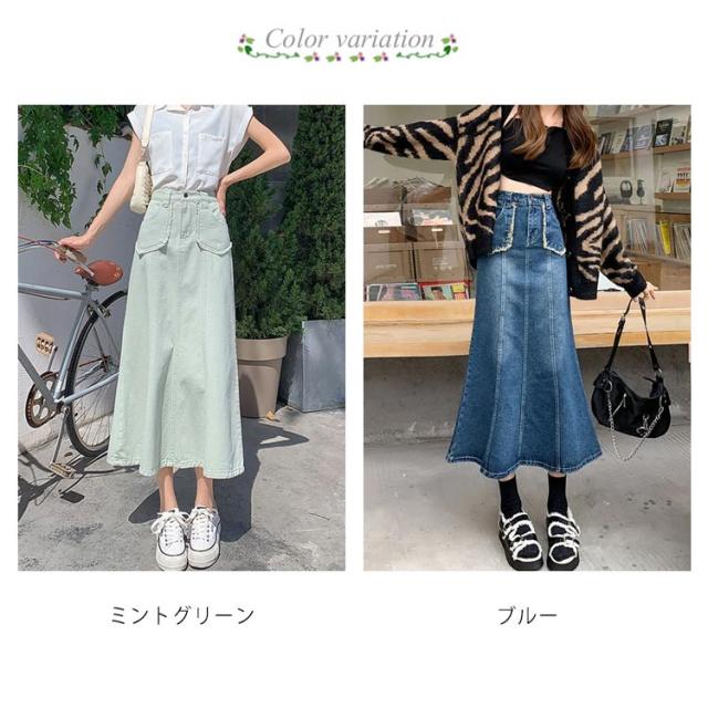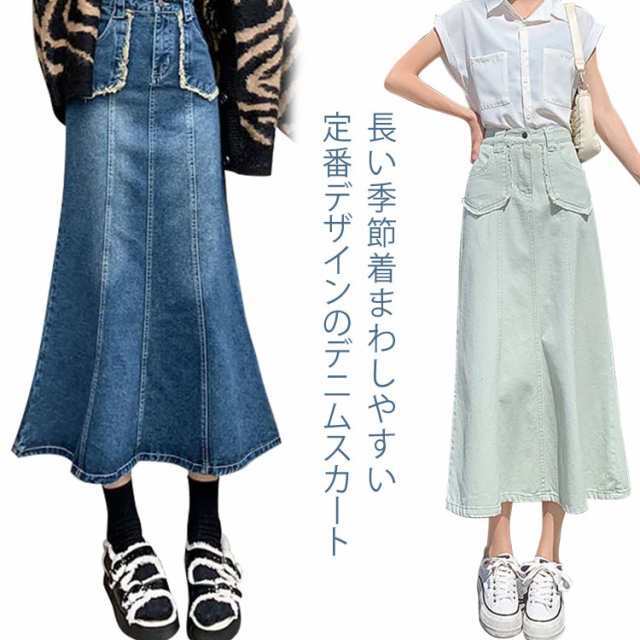 デニムスカート レディース フレア ロング デニム スカート ロングスカート 薄手 ボトムス ポケット フリンジ ストレッチ ミモレ丈 きれいめ 可愛い お洒落 無地 カジュアル ヴィンテージ シンプル 体型カバー