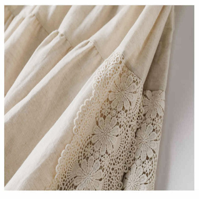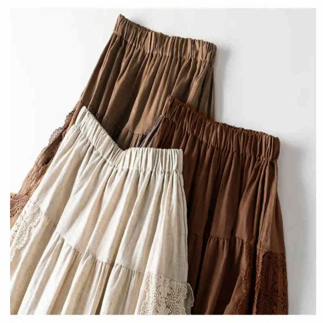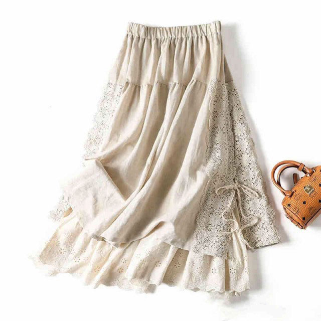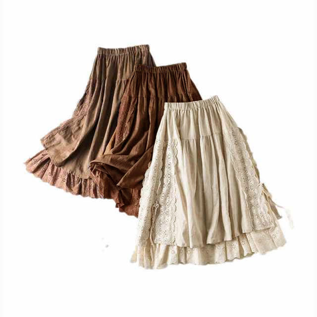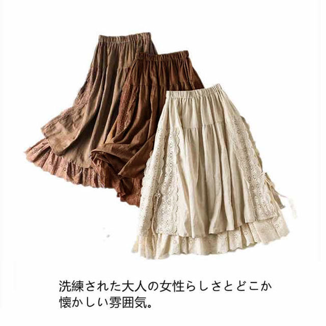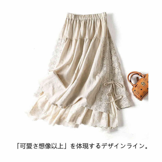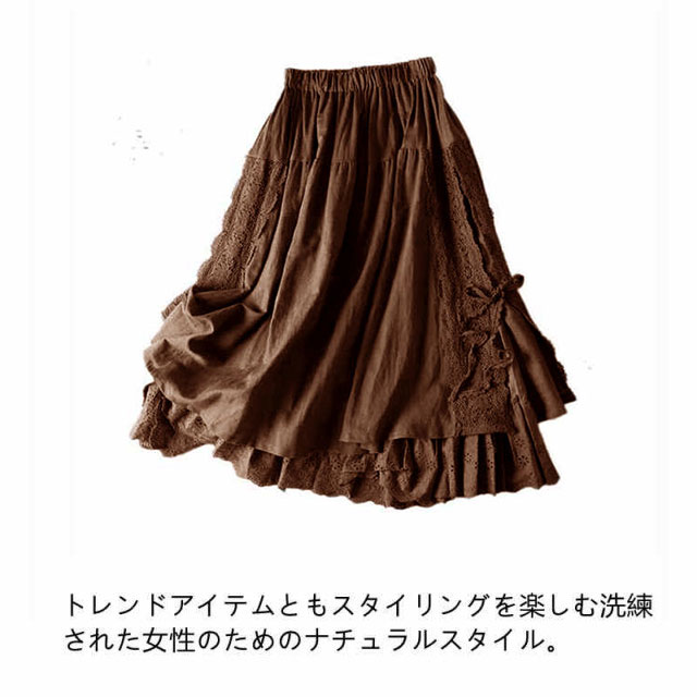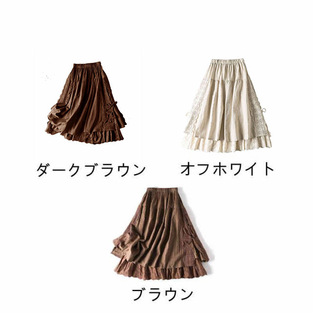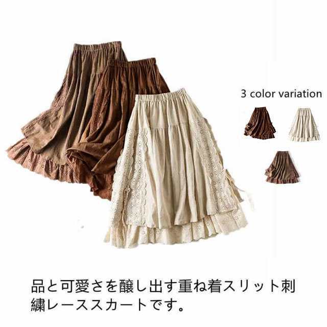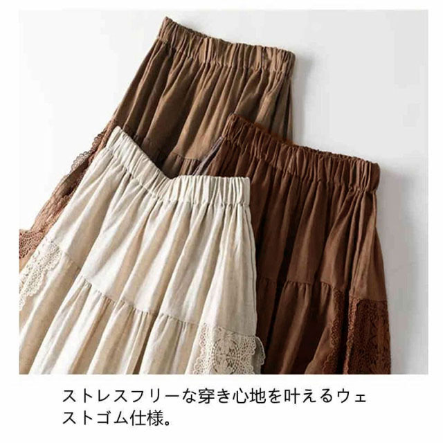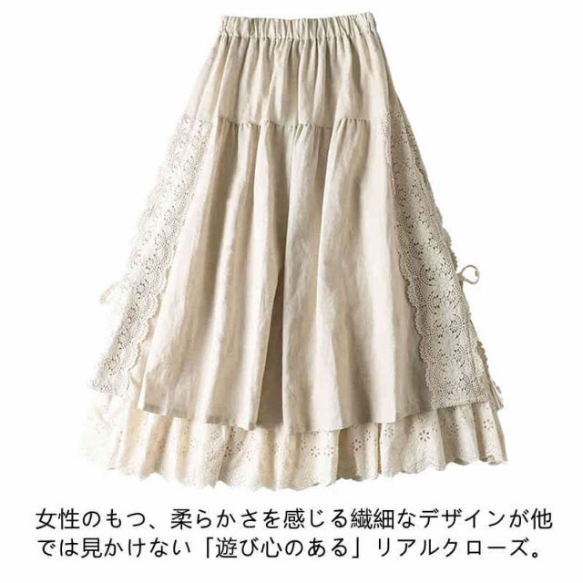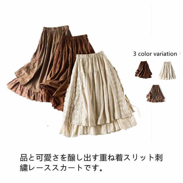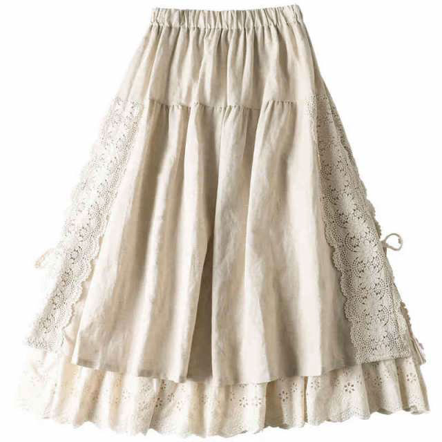 ロングスカート レディース 重ね着スリット レイヤード風 刺繍 レース ナチュラル系 麻 リンネル 天然素材 Aライン 全3色 春服 春物 森ガールズ ボトムス ゆったり 大人 可愛い きれいめ ミセス シンプル 体型カバー