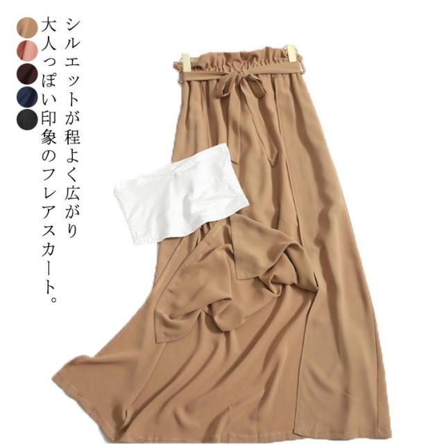 フレアスカート ロングスカート スリット入り ウエストゴム ウエストリボン 無地 レディース ロング丈 スカート 上品 シンプル カジュアル