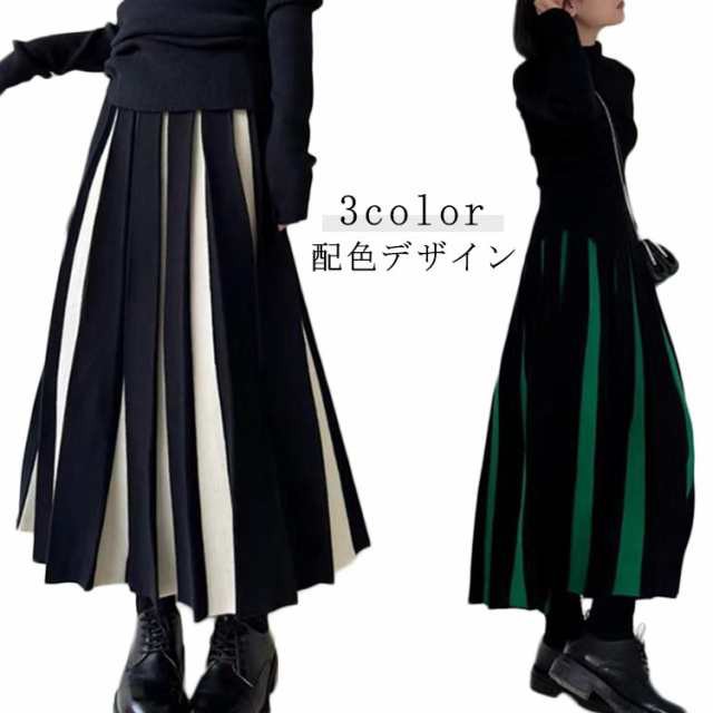 配色 ニット スカート レディース 秋冬 ロングスカート バイカラー 上品 きれいめ ニットスカート ロング丈 スカート ボトムス ミモレ 膝下 ひざ下 プリーツ フレア Aライン ウエストゴム 防寒 ゆったり フレアスカート シンプル