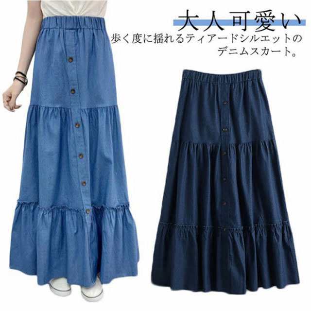 ティアードスカート 切り替え デニム マキシ丈 デニム ギャザースカート 大きいサイズ デニムスカート レディース フレアスカート デニム ロングスカート カジュアル マキシスカート きれいめ 無地 大人可愛い 春 夏
