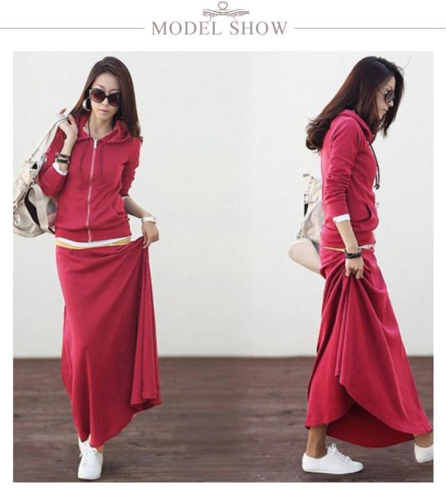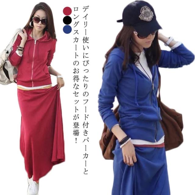 パーカー レディース マキシスカート セットアップ 長袖 春秋 秋冬 フード付き ジップアップ 部屋着 スウェット ジャージ ルームウェア スポーツウェア ロングスカート マキシ丈 おしゃれ かわいい 可愛い 無地
