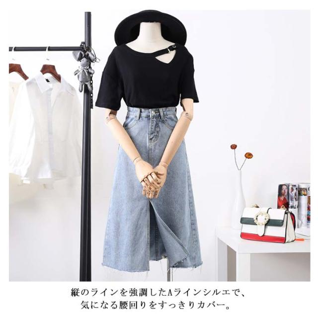 デニムスカート ハイウエスト デニム スカート Aライン 膝丈スカート デニムロングスカート ロングデニムスカート ミドル丈 トレロ 可愛い スリット