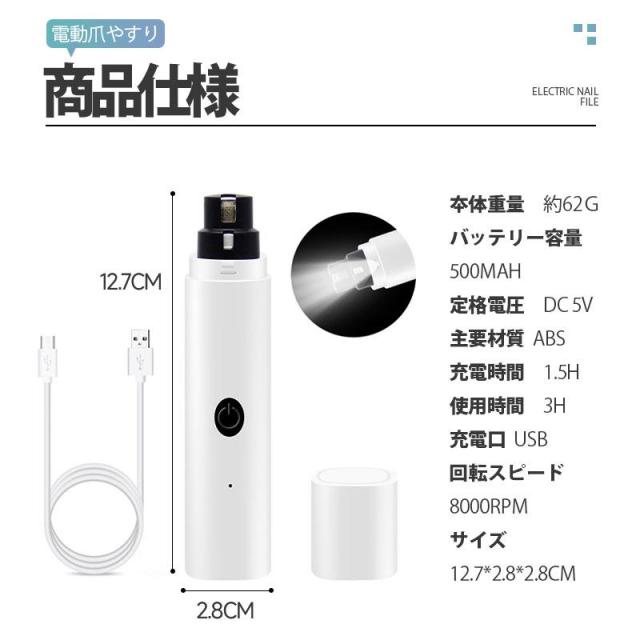 猫爪切り 犬 爪切り 電動 2段階調整 ledライト付犬用爪切 ペット電動爪切り 犬猫兼用 爪研ぎ器 USB充電式 血管を照ら 爪削り 高速回転 静音
