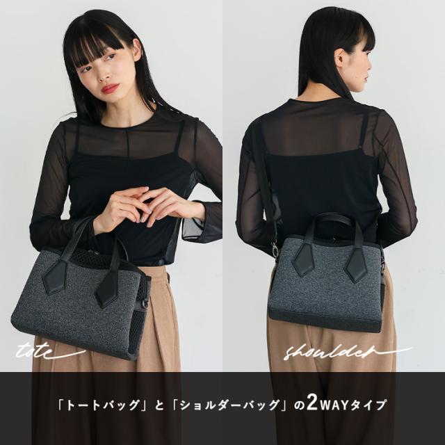 遊び心をプラスされたスクエアトートーバッグ。