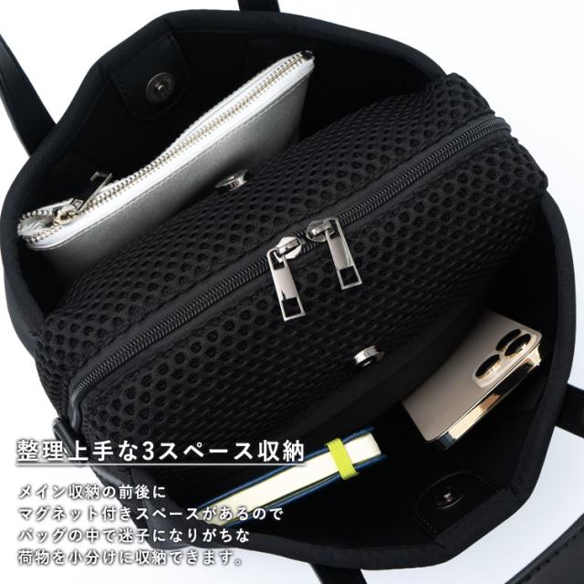 メイン収納の前後にマグネット付きスペースがあるので、バッグの中で迷子になりがちな荷物を小分けに収納できます。