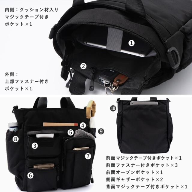 外ポケット:上部ファスナーポケット1、マジックテープポケット前面1・背面1、ファスナーポケット3、オープンポケット、側面/ギャザーポケット