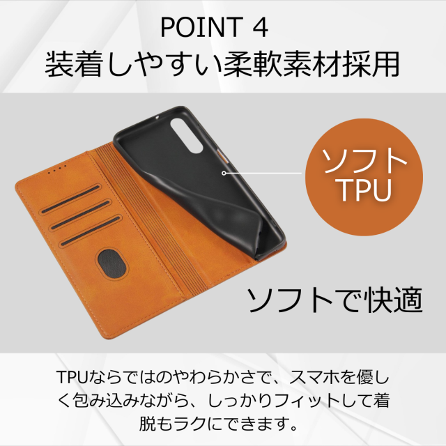 外側は高級感のあるPUレザー、内側は衝撃をやわらげるTPU素材を採用し、大切な端末をしっかり保護します。